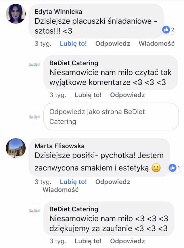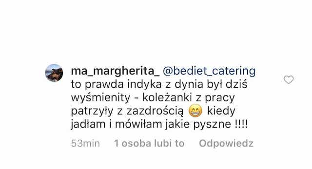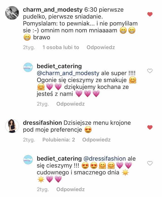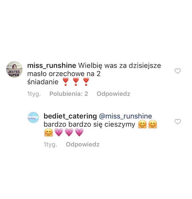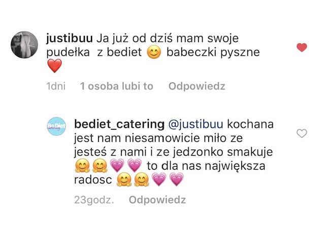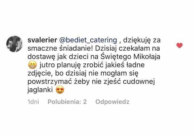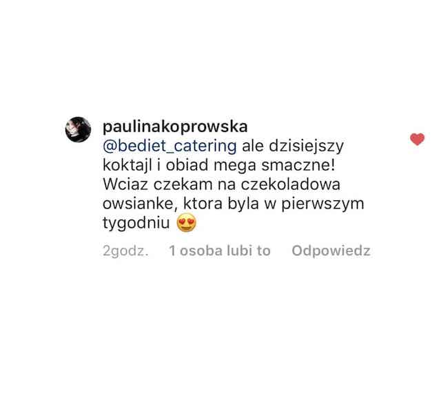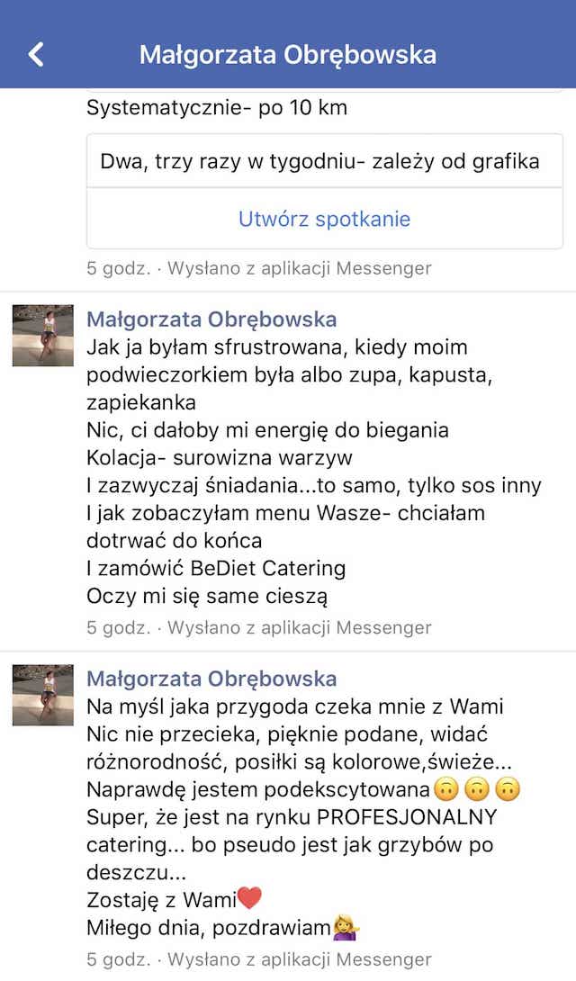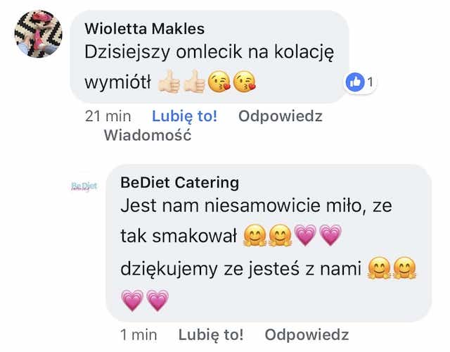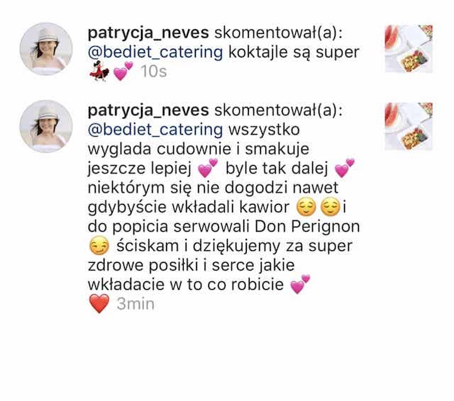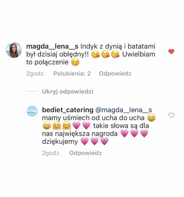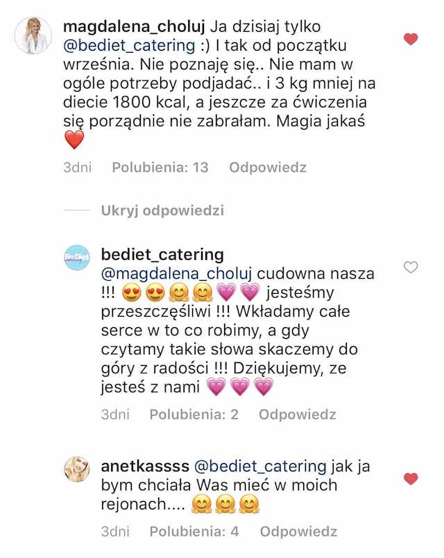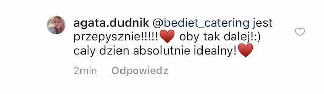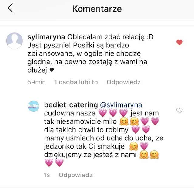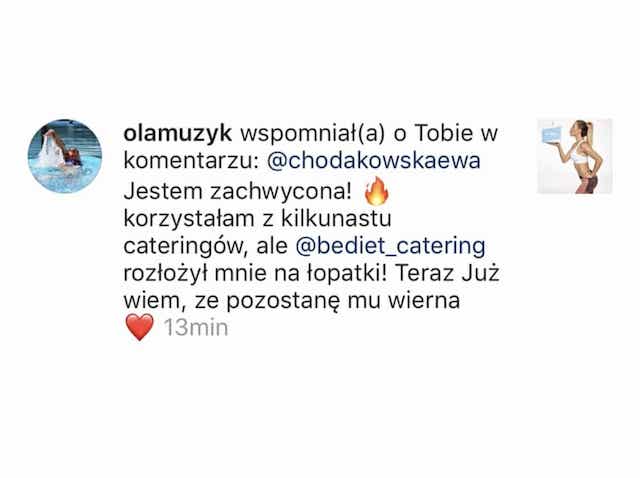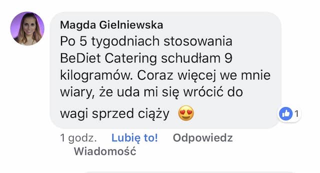 Pudełkowy zawrót głowy! Kochani chciałabym Wam serdecznie podziękować za to, że jesteście ze mną każdego dnia! Dzięki Wam odkrywam smaki i produkty, których nie znałam ale i te o których zapomniałam. Jestem pełna podziwu za pracę, którą wkładacie w to, co robicie, każdy szczegół dopracowany jest do perfekcji, co sprawia że i ja czuję się wyjątkowa. Jakość produktów, świeżość warzyw, soczystość owoców jest nie do opisania!Z BeDiet Catering jestem od 10 września. Początkowo wybrałam wariant bez weekendów ale patrząc na Menu i żałując że omijają mnie takie przysmaki, zdecydowałam się na opcję z pełnymi tygodniami. Dzięki Wam monotonny posiłek z obowiązku, stał się przyjemnością i punktem dnia, na który czekamOdczuwam również znaczną poprawę zdrowia i samopoczucia. Wcześniej mimo, iż byłam na diecie z Bebio trafiałam na różnej jakości produkty w sklepach a zabiegany tryb życia czasem kierował posiłek jednak ku szybszym rozwiązaniom, co kończyło sie problemami żołądkowymi. Teraz dzięki Wam, ćwiczeniom Ewy i wsparciem Vivity mam energię i siłę na każdy dzień!I biorąc pod uwagę, ze mój mąż początkowo patrzył na moje magiczne pudełeczka z nutą wątpliwości teraz sam pierwszy leci do drzwi i pyta “Co masz?”, “O, jak ładnie wygląda!”, “Dasz spróbować?” Więc jestem przekonana, że niedługo będziemy z Wami oboje !!!BeDiet Catering – przez żołądek do serca i zdrowia!Pozdrawiam Wszystkich ciepło i dziękuję raz jeszcze.Ola Karasiewicz