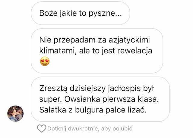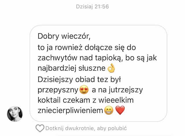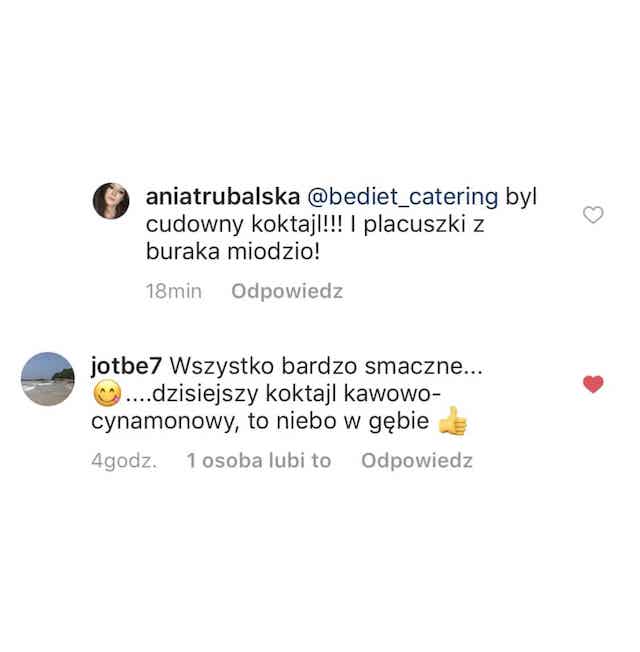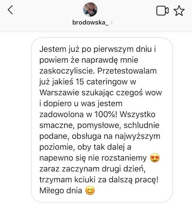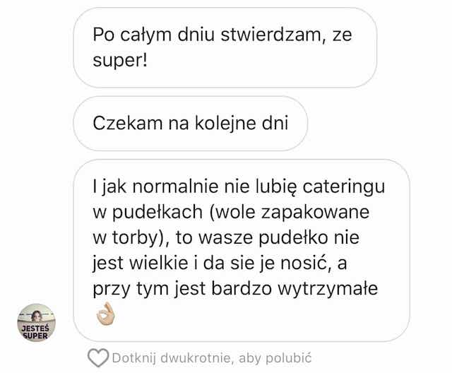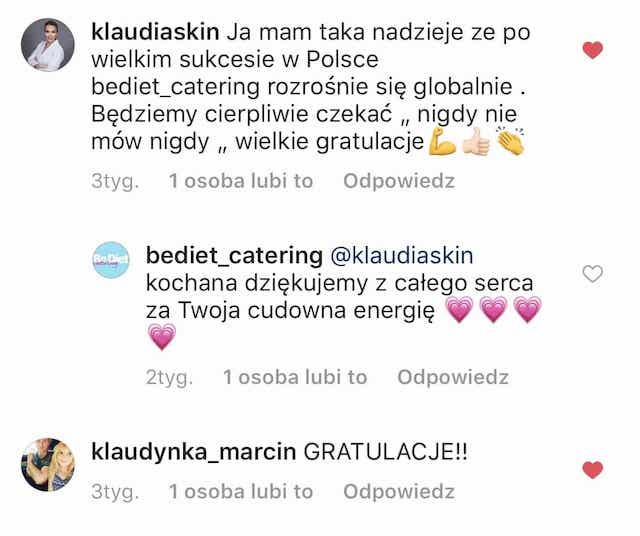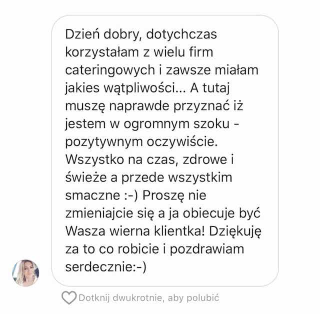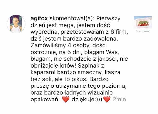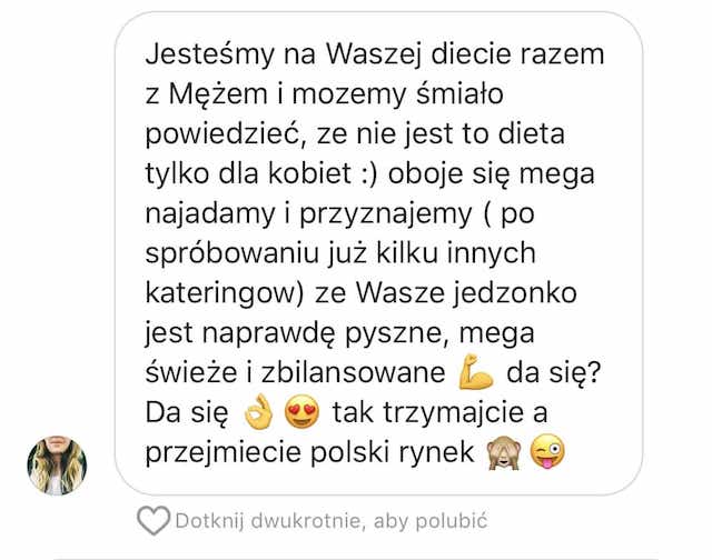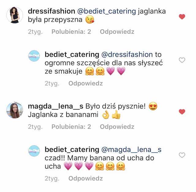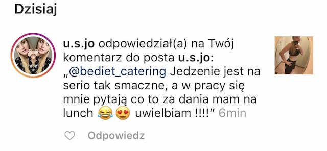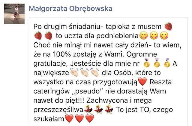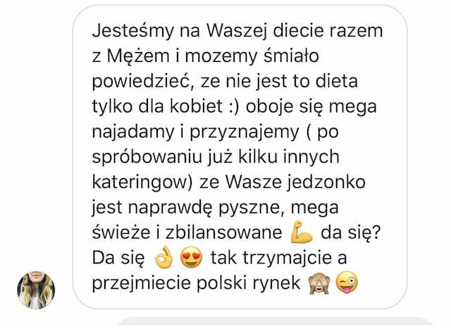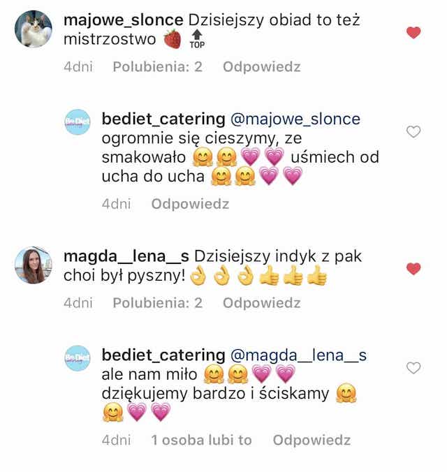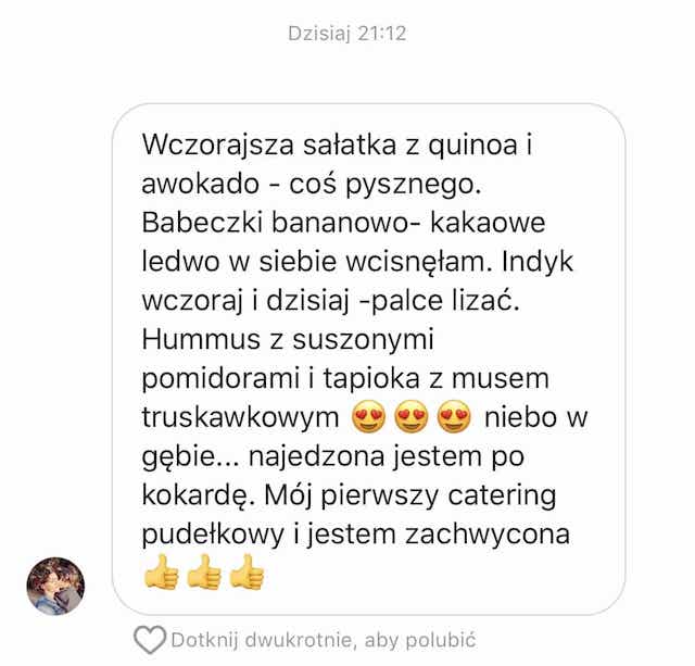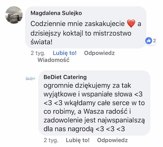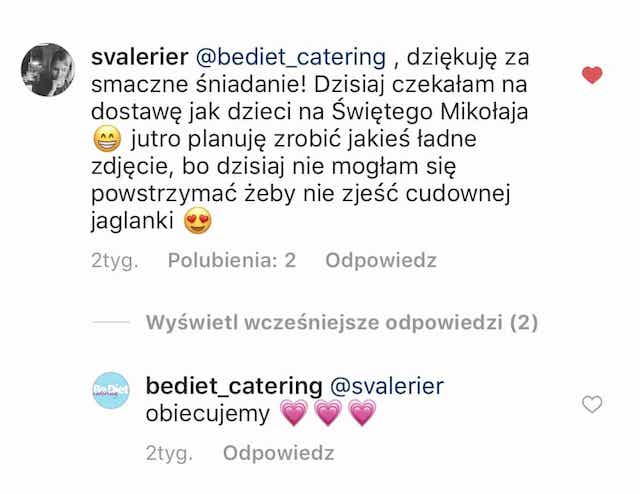 Pudełkowy zawrót głowy! Kochani chciałabym Wam serdecznie podziękować za to, że jesteście ze mną każdego dnia! Dzięki Wam odkrywam smaki i produkty, których nie znałam ale i te o których zapomniałam. Jestem pełna podziwu za pracę, którą wkładacie w to, co robicie, każdy szczegół dopracowany jest do perfekcji, co sprawia że i ja czuję się wyjątkowa. Jakość produktów, świeżość warzyw, soczystość owoców jest nie do opisania!Z BeDiet Catering jestem od 10 września. Początkowo wybrałam wariant bez weekendów ale patrząc na Menu i żałując że omijają mnie takie przysmaki, zdecydowałam się na opcję z pełnymi tygodniami. Dzięki Wam monotonny posiłek z obowiązku, stał się przyjemnością i punktem dnia, na który czekamOdczuwam również znaczną poprawę zdrowia i samopoczucia. Wcześniej mimo, iż byłam na diecie z Bebio trafiałam na różnej jakości produkty w sklepach a zabiegany tryb życia czasem kierował posiłek jednak ku szybszym rozwiązaniom, co kończyło sie problemami żołądkowymi. Teraz dzięki Wam, ćwiczeniom Ewy i wsparciem Vivity mam energię i siłę na każdy dzień!I biorąc pod uwagę, ze mój mąż początkowo patrzył na moje magiczne pudełeczka z nutą wątpliwości teraz sam pierwszy leci do drzwi i pyta “Co masz?”, “O, jak ładnie wygląda!”, “Dasz spróbować?” Więc jestem przekonana, że niedługo będziemy z Wami oboje !!!BeDiet Catering – przez żołądek do serca i zdrowia!Pozdrawiam Wszystkich ciepło i dziękuję raz jeszcze.Ola Karasiewicz